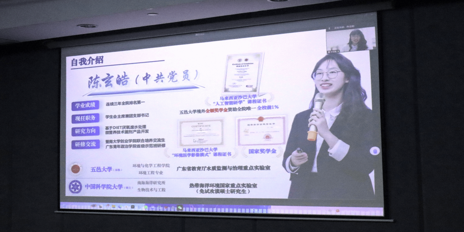 接着,由学院邀请到的中国科学院大学研究生陈玄皓作为首届全国大学生职业规划大赛的国赛选手,以自身参赛经历为例,分享了自己在准备比赛过程中的逻辑梳理、ppt结构、路演准备等内容。同时,她还寄语师弟师妹们要明晰职业方向,积极准备,开启职业规划的探索之旅。