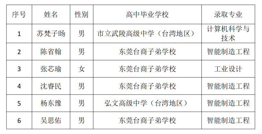 根据教育部有关文件和《东莞理工学院2022年依据台湾地区大学入学考试学科能力测试成绩招收台湾地区高中毕业生招生简章》等文件精神,经过报名审核、评委面试,现将拟录取名单和拟录取专业予以公示,公示期为2022年4月29日- 5月12日。若对成绩有疑问者,请于公示期内提出,过期不再受理。