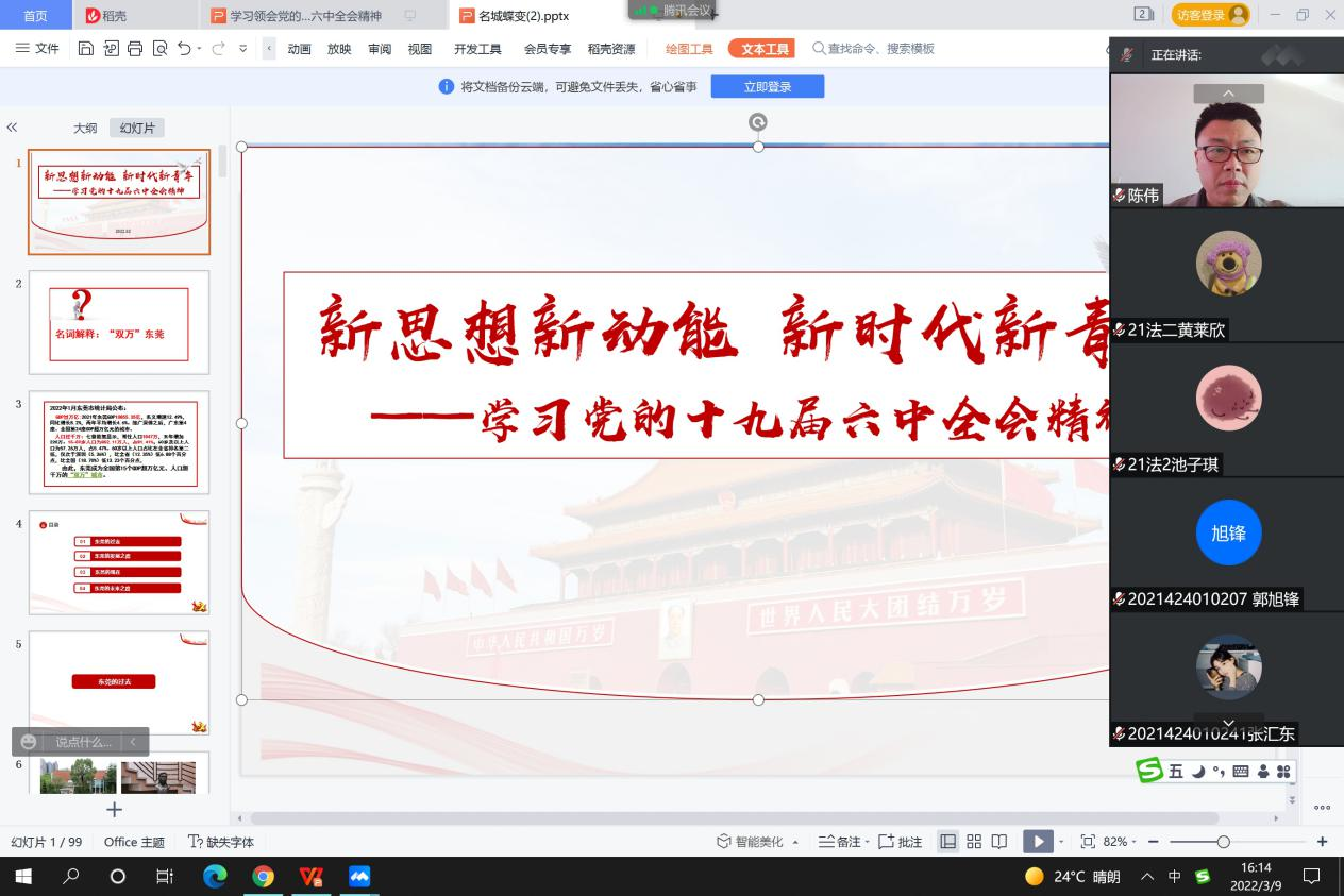 为深入学习贯彻党的十九届六中全会精神,进一步深化拓展党史学习教育,3月9日,sunbet申博,申博官网,sunbet官网院长陈伟于线上为21级法社1班、2班,21级社工1班、2班学生上思政课。