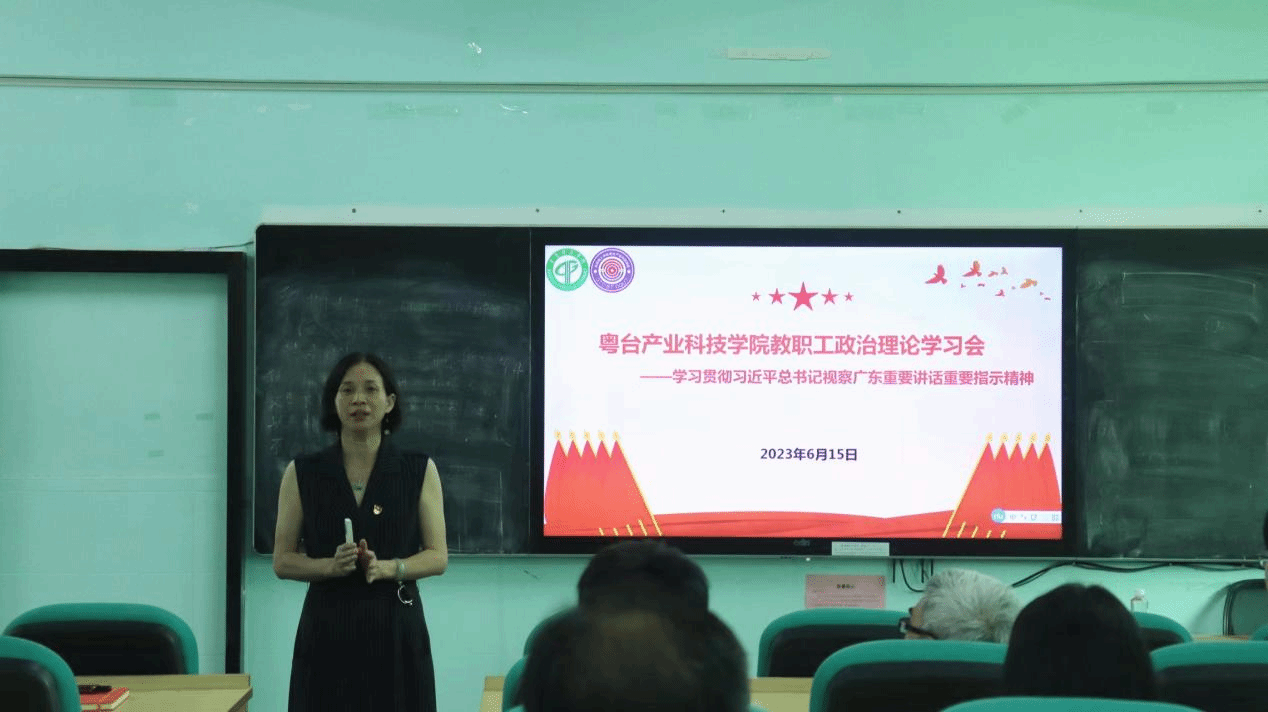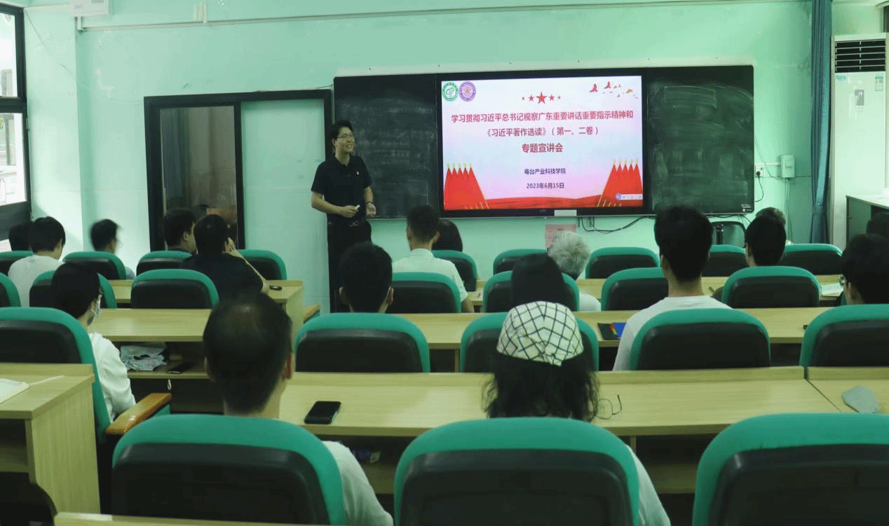 为推动学习贯彻习近平新时代中国特色社会主义思想主题教育走深走实,6月15日,粤台学院党委在莞城校区实验楼305多功能教室开展“学习贯彻习近平总书记视察广东重要讲话重要指示精神和《习近平著作选读》第一卷、第二卷”专题宣讲会。学院全体教职工、师生党员、学生代表等参加了专题学习,宣讲会由学院党委书记宋美娴主持,马克思主义学院马冀群博士主讲。