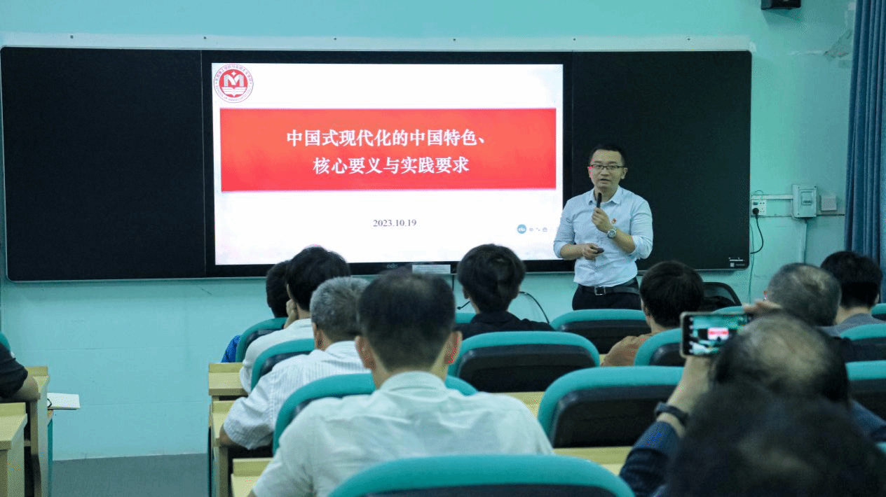 为进一步深入学习贯彻习近平新时代中国特色社会主义思想,帮助全体教职工更好地理解中国式现代化的丰富内涵和核心要义。sunbet申博,申博官网,sunbet官网于10月19日下午,在莞城校区实验楼305阶梯教室开展学习宣传《中国式现代化面对面》专题辅导暨全体教职工政治理论学习会。学院邀请了马克思主义学院毛安翼副教授作专题辅导报告,学院全体教职工、师生党员等参加了专题学习,学习会由学院党委书记宋美娴主持。