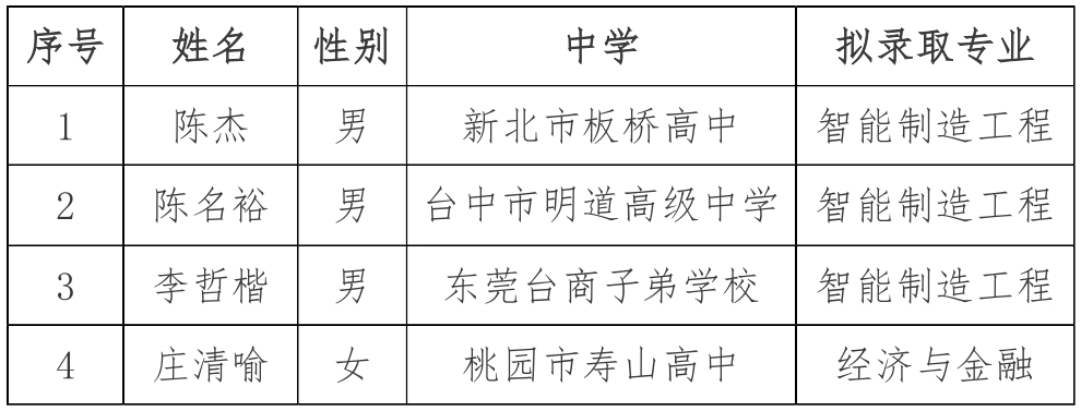 根据教育部有关文件和《东莞理工学院2020年依据台湾地区大学入学考试学科能力测试成绩招收台湾地区高中毕业生招生简章》等文件精神,经过报名审核、评委面试,现将拟录取名单和拟录取专业予以公示,公示期为2020年6月8日- 6月26日。对成绩有疑问者,请于公示期内提出,过期不再受理。