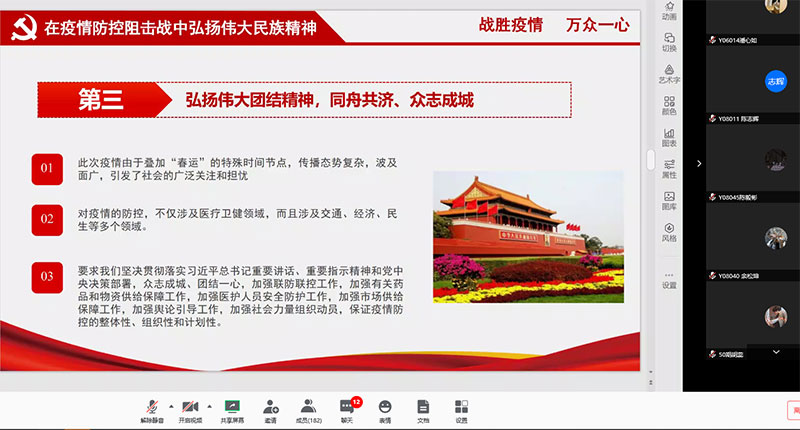 为进一步贯彻落实习近平总书记对新冠肺炎疫情防控工作的重要指示精神,把疫情防控工作作为巩固深“不忘初心、牢记使命”主题教育的再深化、深检验,充分发挥基层党支部战斗堡垒作用及党员先锋模范作用,3月26日,sunbet申博,申博官网,sunbet官网党支部通过腾讯会议APP线上组织开展“弘扬民族精神凝聚众志成城抗击疫情强大力量”主题党课,支部书记陈伟主讲,支部师生党员、积极分子约180余人参加。