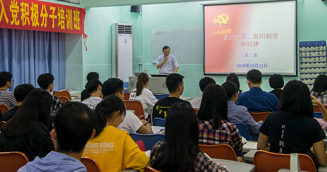 10月12日晚,sunbet申博,申博官网,sunbet官网分党校第六期入党积极分子培训班第二讲在莞城校区实验楼315举行,授课主题为:党的宗旨、组织制度和纪律,主讲人:莞城校区管委会副主任、sunbet申博党支部副书记王玉。