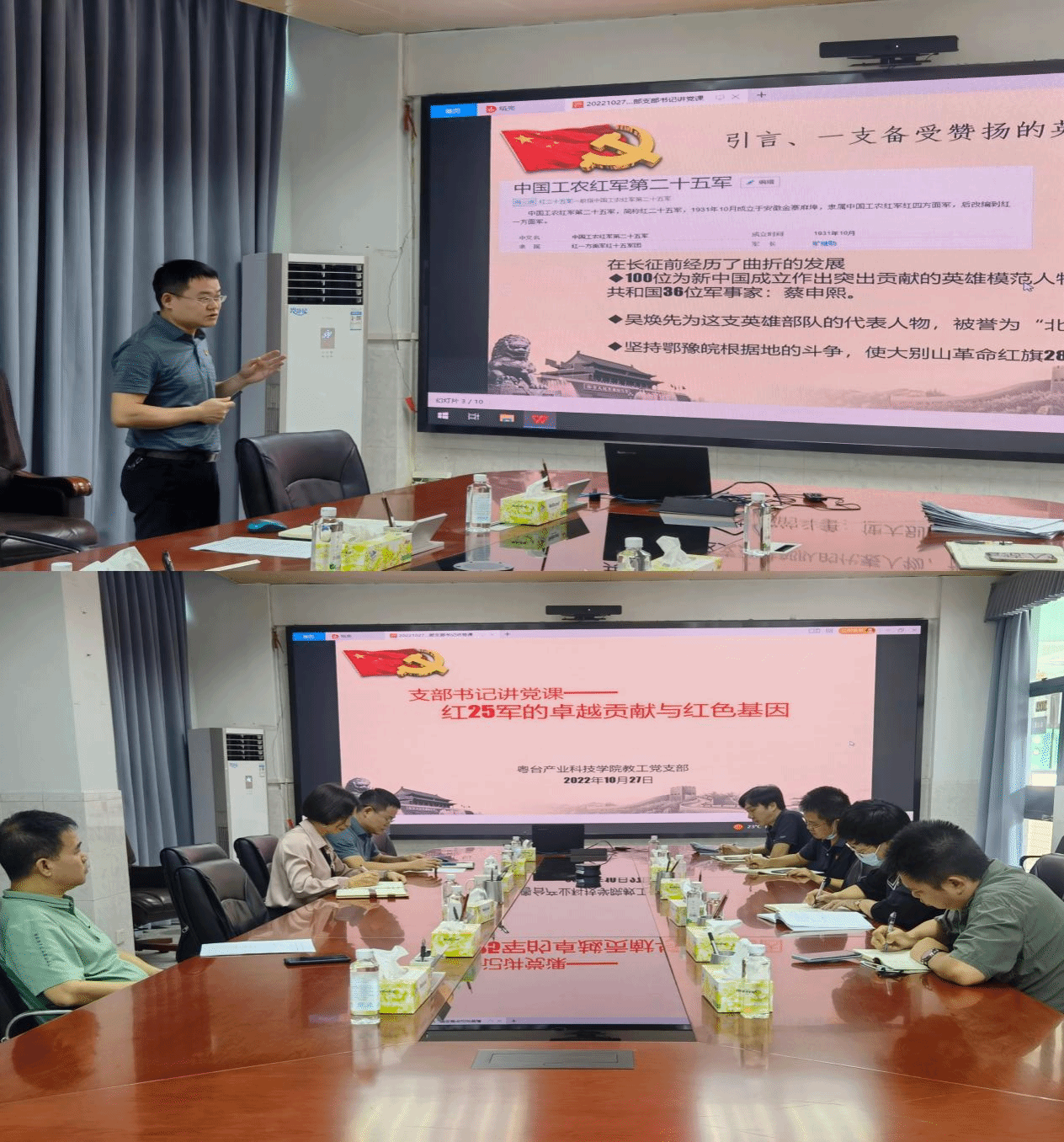 10月27日上午,学院教工党支部在莞城校区实验楼302会议室开展了以“红25军的卓越贡献与红色基因”为主题党课活动,本次党课由党支部书记谢春晓主讲,教工党支部全体党员参加。
