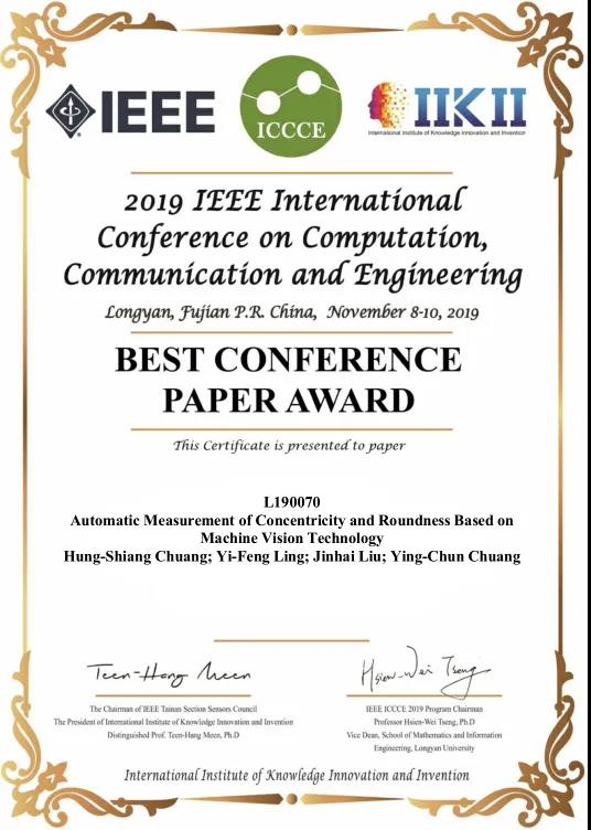 11月8-10日,通信、计算与工程国际研讨会(IEEE ICCCE 2019)在中国福建召开,sunbet申博庄宏祥教授指导2016级机械专业学生凌奕锋撰写的论文“Automatic Measurement of Concentricity and Roundness Based on Machine Vision Technology”获最佳论文奖。