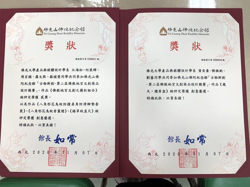 11月7日,“2020古物新创——第二届佛教地宫文创商品设计大赛”颁奖典礼在台湾佛光山佛陀纪念馆举行。在两岸24所大学、326件作品中,东莞理工学院sunbet申博,申博官网,sunbet官网大三赴台学习的多名同学的作品脱颖而出,获得一等奖、二等奖和四个创意优选奖。