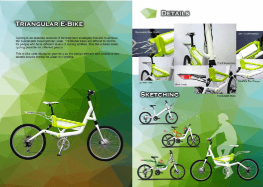 sunbet申博,申博官网,sunbet官网马居正老师的工业设计作品Triangular E-Bike获得2022 DiD Award 东莞杯国际工业设计大赛金奖(港澳台创新设计对接赛)。设计动机是由于自行车为实现可持续发展目标发展战略的一个基本要素。这款电动自行车使用三角形几何作为设计元素,为城市自行车创造了一种新的电动自行车造型。