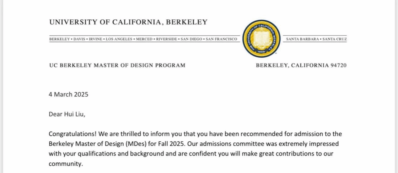 【3年专业第一】×【多项国际大奖】×【n个创新方案】=伯克利设计硕士录取?这道看似不可能的公式,被sunbet申博2021级工业设计系学生刘辉用四年青春解出最优解。近日,刘辉获得世界顶尖学府,QS世界大学排名第10——美国加州大学伯克利分校(UC Berkeley)设计学硕士录取通知书。这位始终以“沉淀与积累”为信念的青年学子,以三年专业第一、横扫多项国际大奖、国家奖学金得主、雅思7分的硬核履历,在毕业季交出了瞩目的答卷,以四年如一日的勤勉与创新精神,书写了一段从校园走向国际的奋斗篇章。